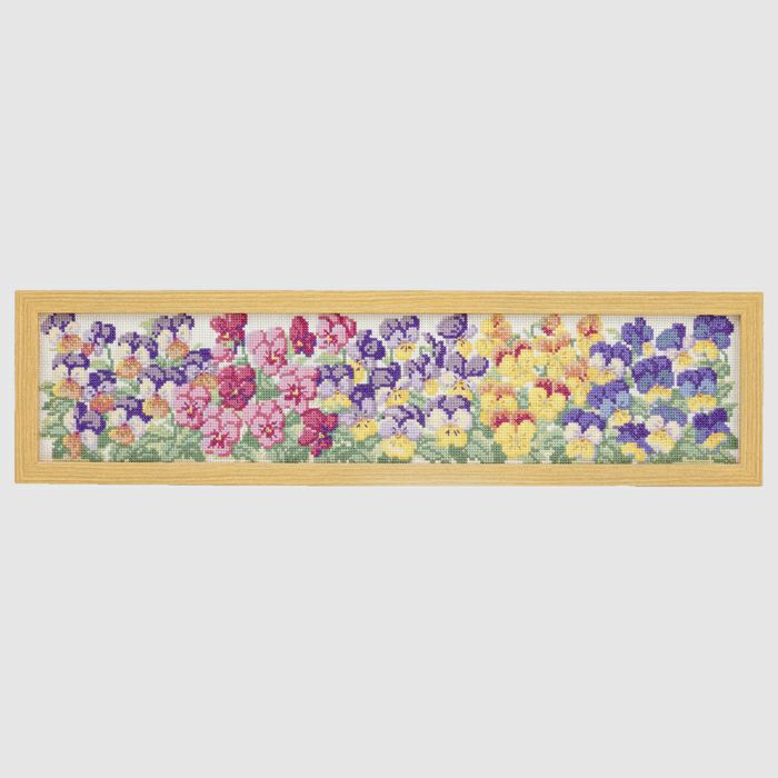 早春花園裡一朵朵盛開的中提琴被十字繡在水平框架上。重點是色彩繽紛的花朵的陰暗表情。該商品非常適合春季室內裝飾。