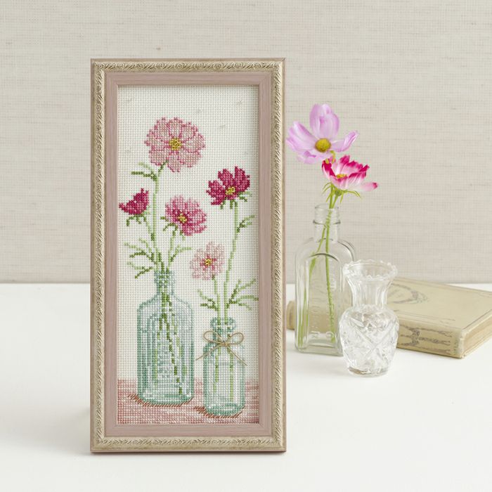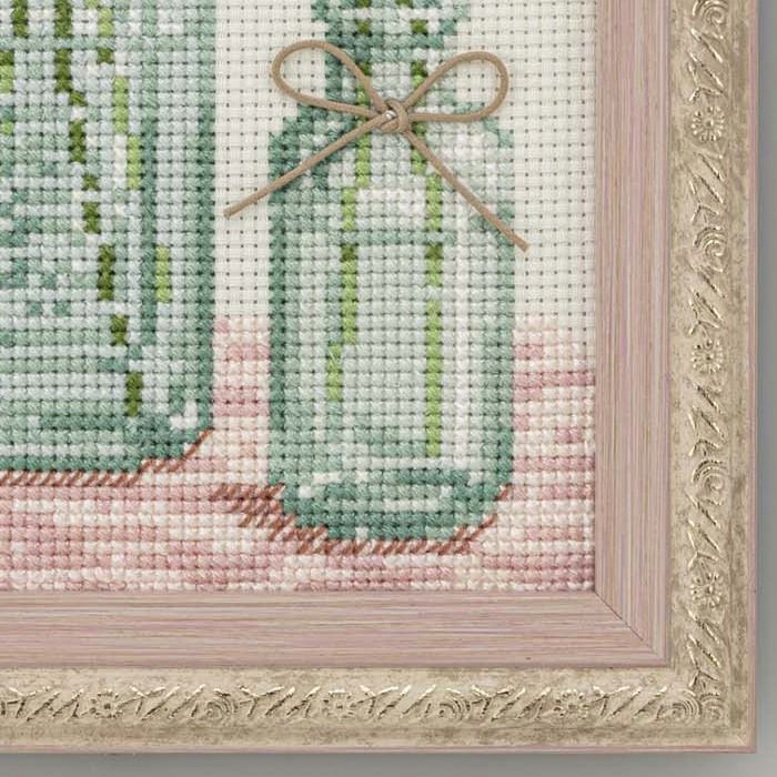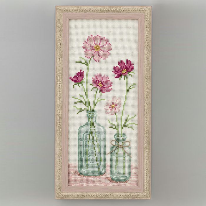厚實的玻璃瓶中靜物般的宇宙以成熟的配色方案進行十字繡。享受用灰粉色裝飾框展示您的藝術作品的感覺。