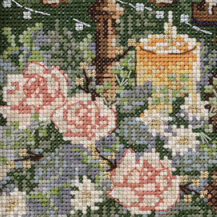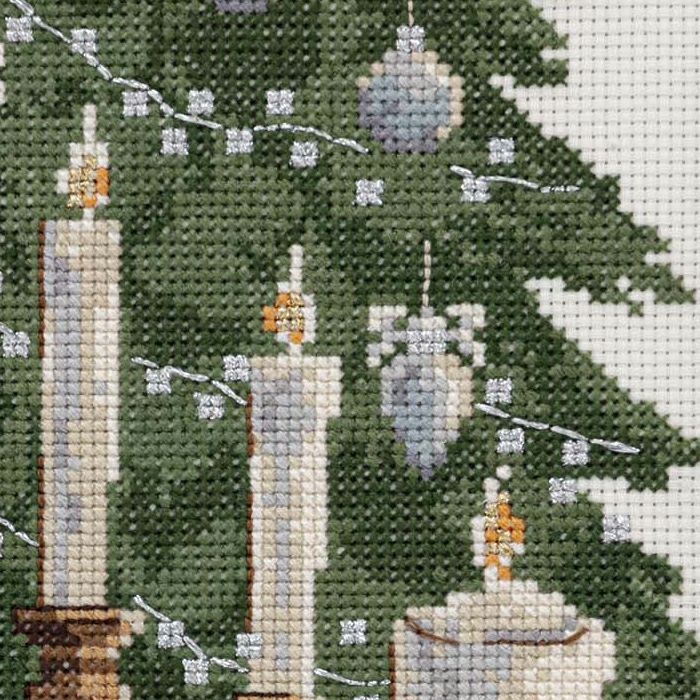 桌子上裝飾著經典的蠟燭和鮮花,背景是一棵樹,以成熟的色彩表現出來。帶有浮雕的十字繡框架將引導您享用聖夜的優雅晚餐。