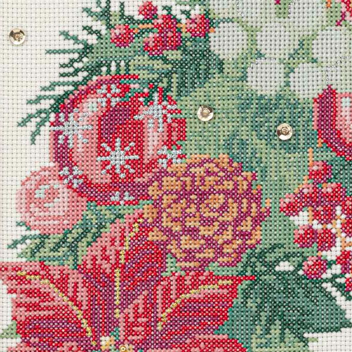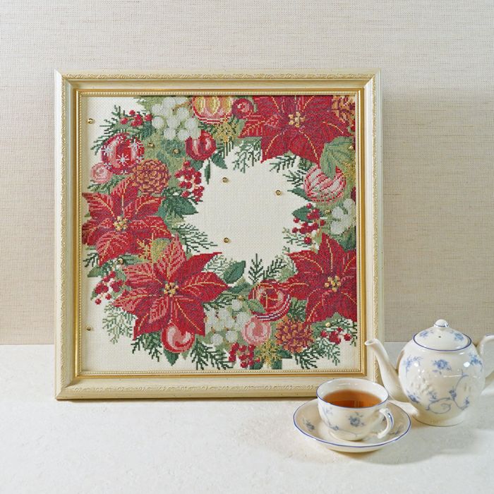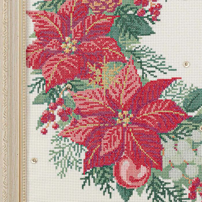 十字繡以一品紅為主花,配上紅、白莓、松果等的花環。添加金色和銀色閃光光和亮片,與傳統的聖誕裝飾搭配起來非常漂亮。
