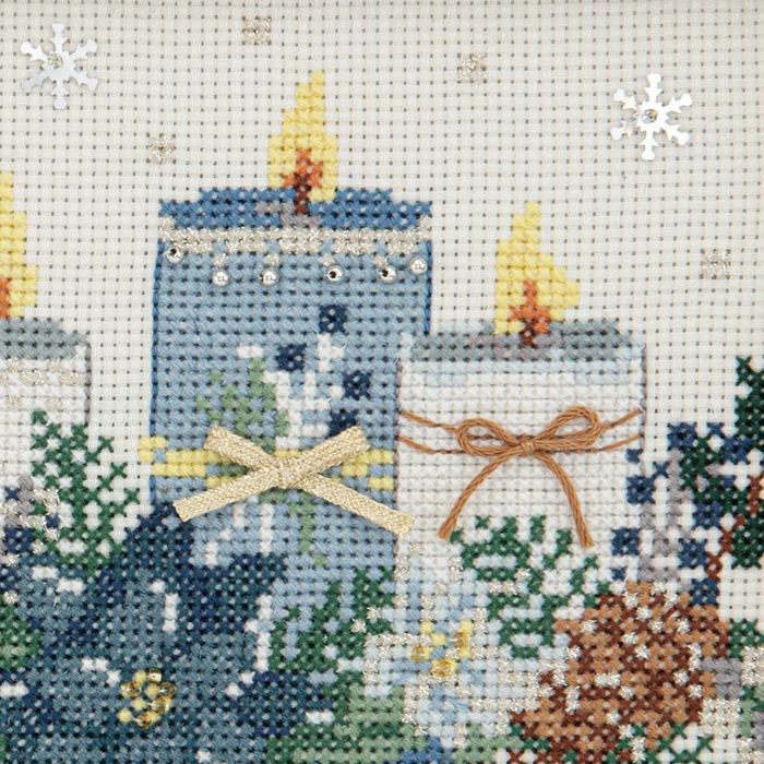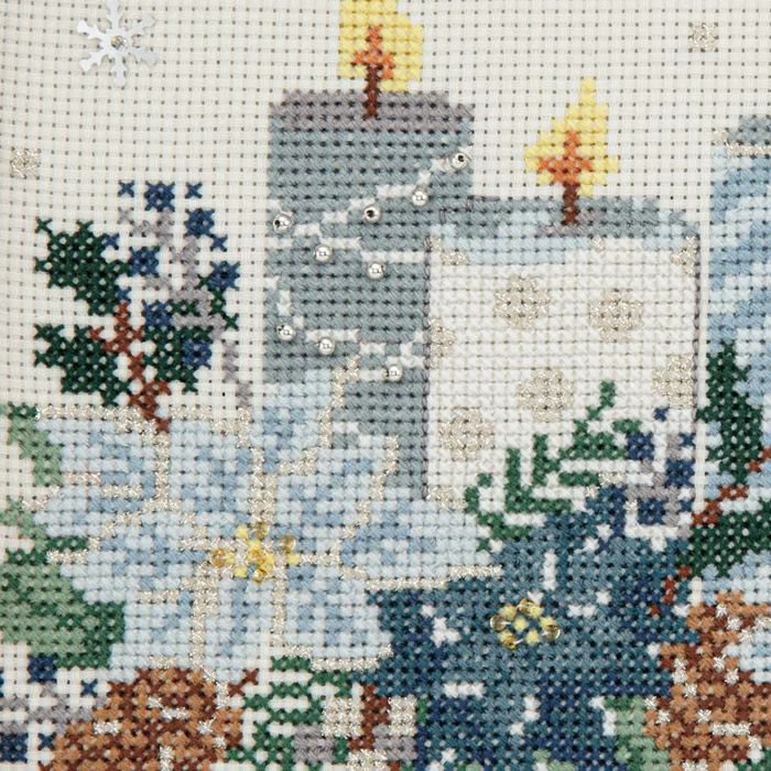 據說聖誕節點燃的蠟燭充滿了幸福和安康的願望。十字繡點燃的蠟燭和聖誕節佈置的植物。最後呈現出一種朦朧的成人色彩。
