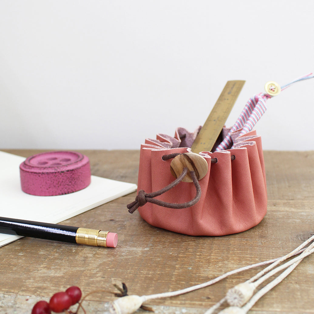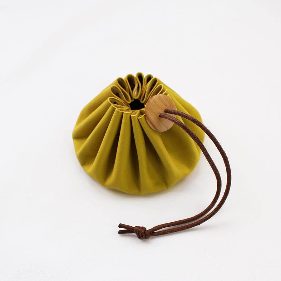 這款優雅的皮革小袋色彩鮮豔,易於攜帶,可用於縫製創意和配件或其他小型個人物品。這款皮夾的形狀就像一個豐滿的花蕾。當你鬆開木紐扣和繩子時,它就像一朵盛開的花朵一樣展開。展開的小袋子還可以用作托盤,當您想做一些針線時非常方便。
