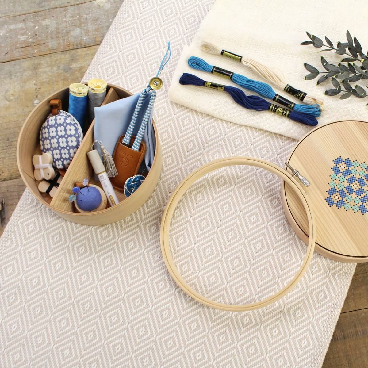 這是一套精美的禮品套裝,包含 Cohana 流行的基本縫紉用品,裝在美麗的木製 Magewappa 工具箱中。蓋子上採用柔和色彩的十字繡設計。工具箱配有可拆卸的繡花箍,可輕鬆嵌套在工具箱的外緣上。