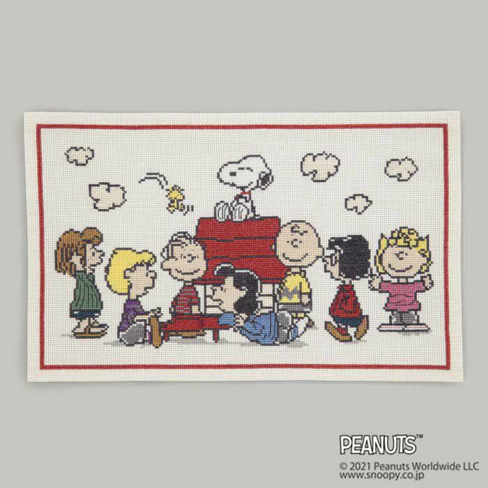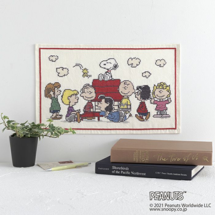 朋友們聚集在史努比的紅頂屋裡十字繡。生動、多彩地描繪了史努比和他的朋友們帶著可愛的笑容。