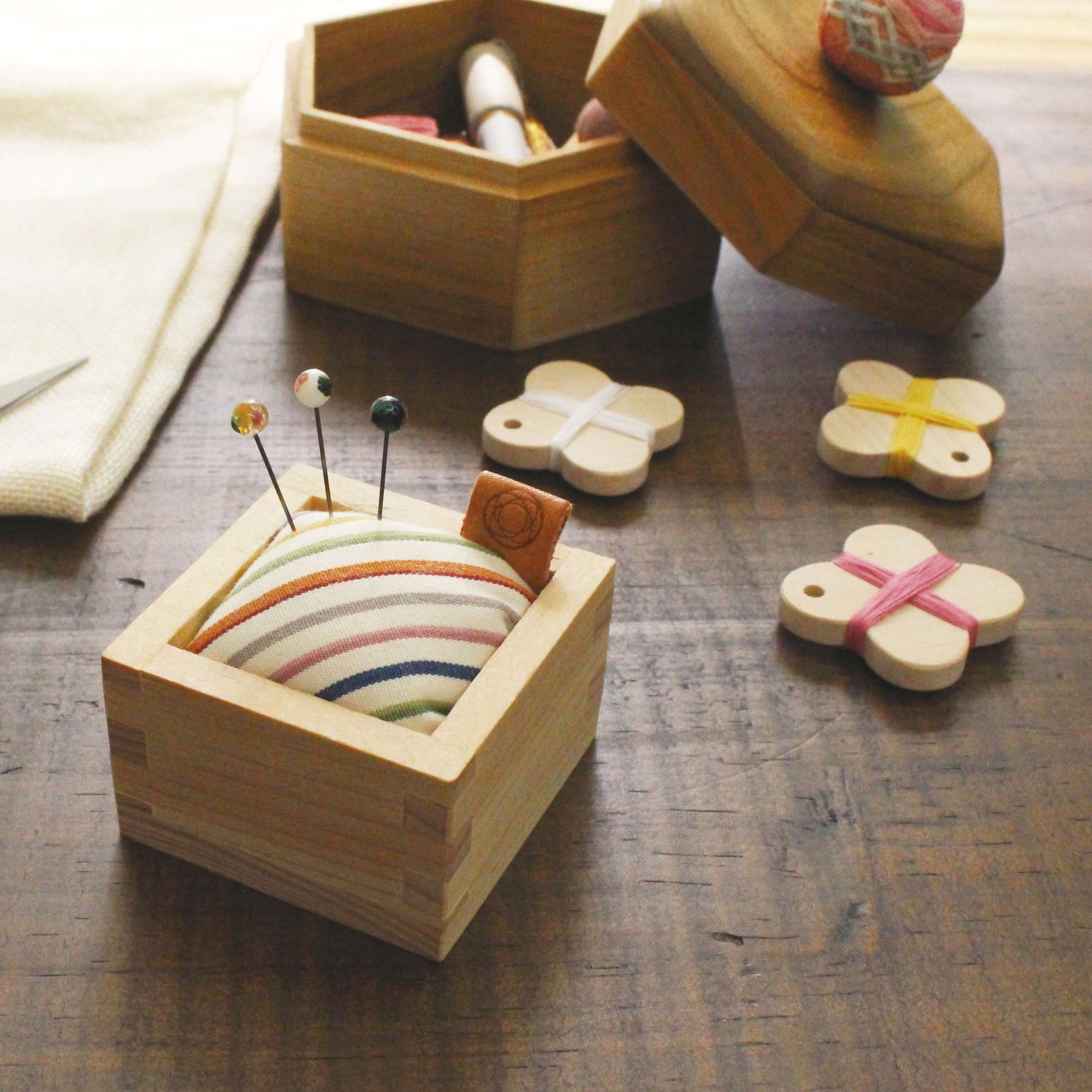 帶有小倉紡織品的 Masu 盒形針墊和三枚採用七寶工藝製作的獨特別針。