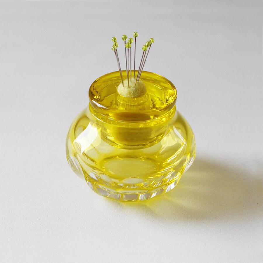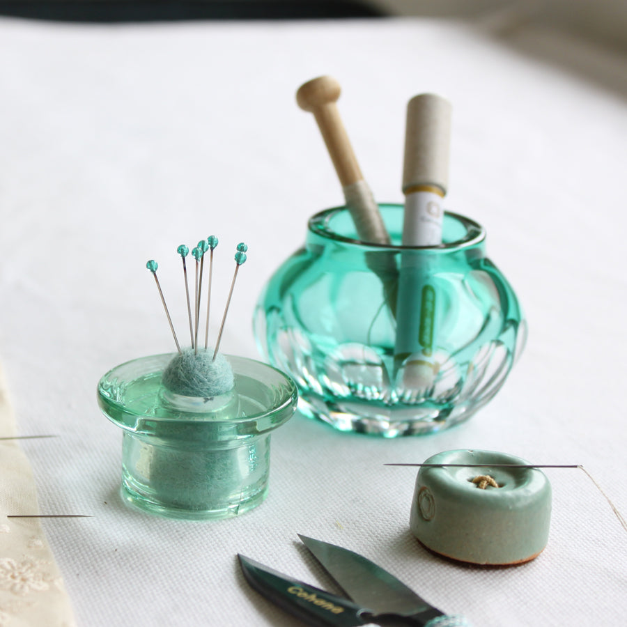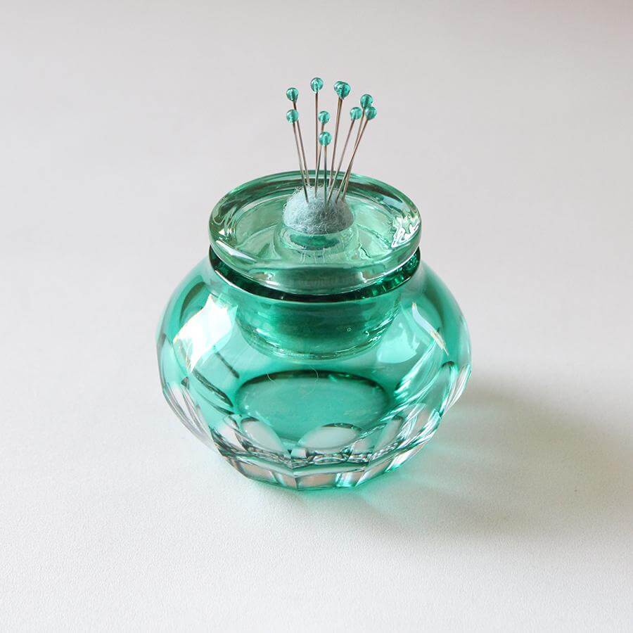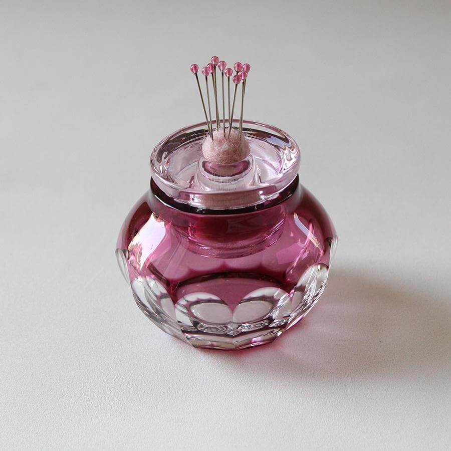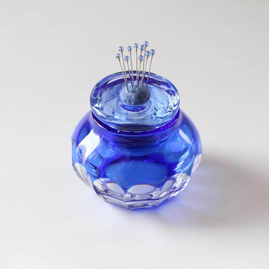 美麗的 Otaru Kiriko 玻璃針墊套裝,配有 10 個顏色協調的玻璃縫紉針。小樽 Kiriko 玻璃枕形枕是由工匠在北海道小樽手工製作的,是一款獨一無二的豐滿花盆形狀的枕形枕,配有配套的縫紉別針和毛氈墊。
