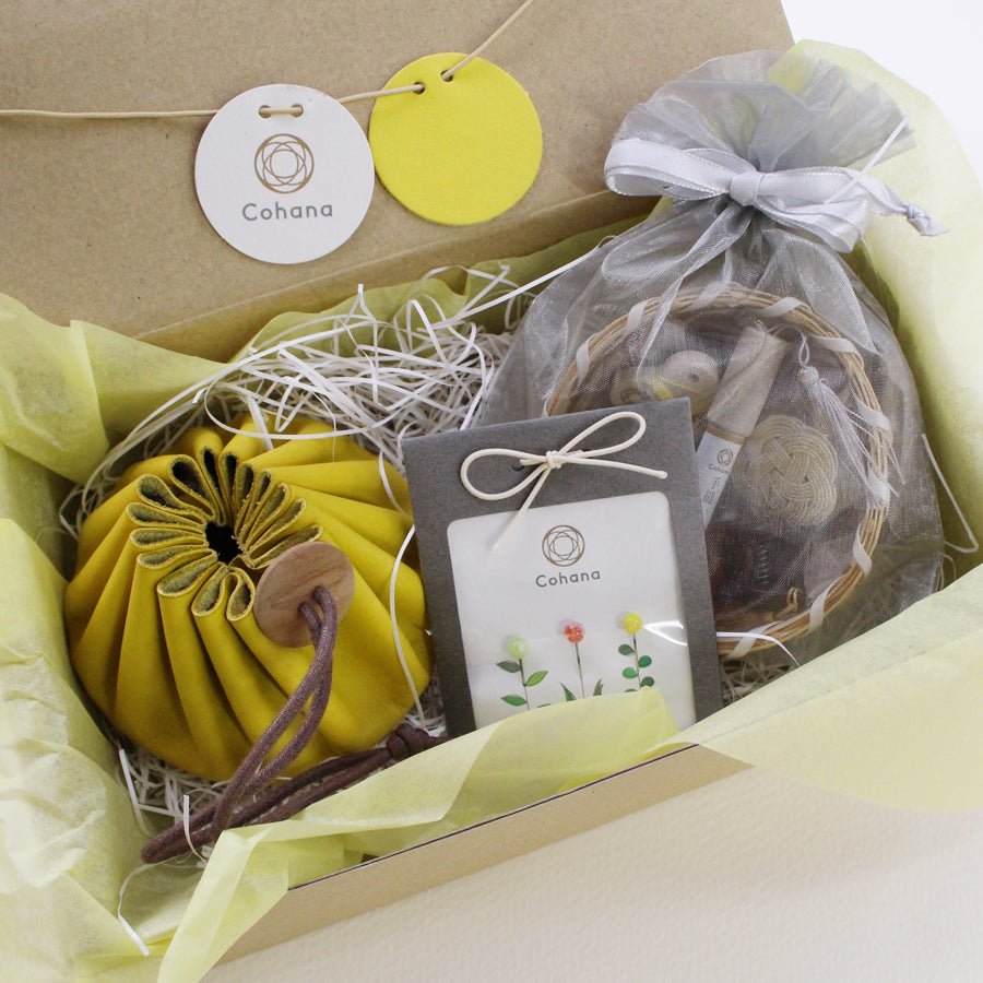 Cohana 最受歡迎的 7 件商品裝在一個盒子裡。所有物品都可以放入美麗的姬路皮革袋中。有了這套套裝,您可以隨時隨地為任何需要縫紉的場合做好準備。